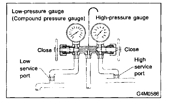 3. Attach the high- and low-pressure manifolds to the high and low services port on the vehicle.