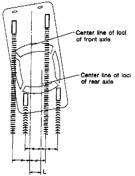 c. When left and right adjusting bolts are turned incrementally by one graduation in the same direction, the thrust angle of the AWD model will change approximately 10' ["L" is almost equal to 7.5 mm (0.295 inch)] and the thrust angle of the FWD model will change approximately 12' ["L" is almost equal to 9 mm (0.35 inch)].