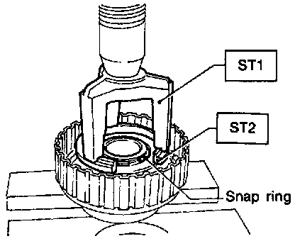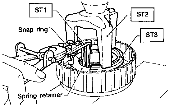4. Remove the snap ring with ST1, ST2, ST3 and press, and take out the spring retainer.