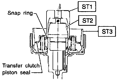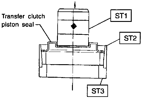 4. Place ST3 onto rear drive shaft so that spring can be inserted into hole in transfer piston seal.