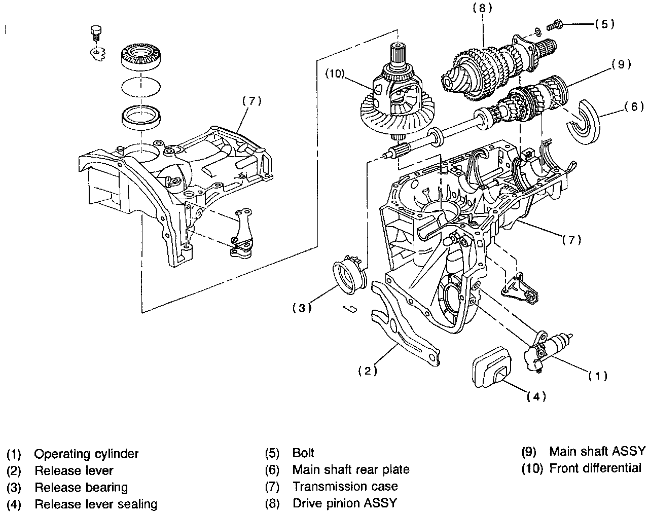 6. Separate transmission case into right and left cases by loosening seventeen coupling bolts and nuts.