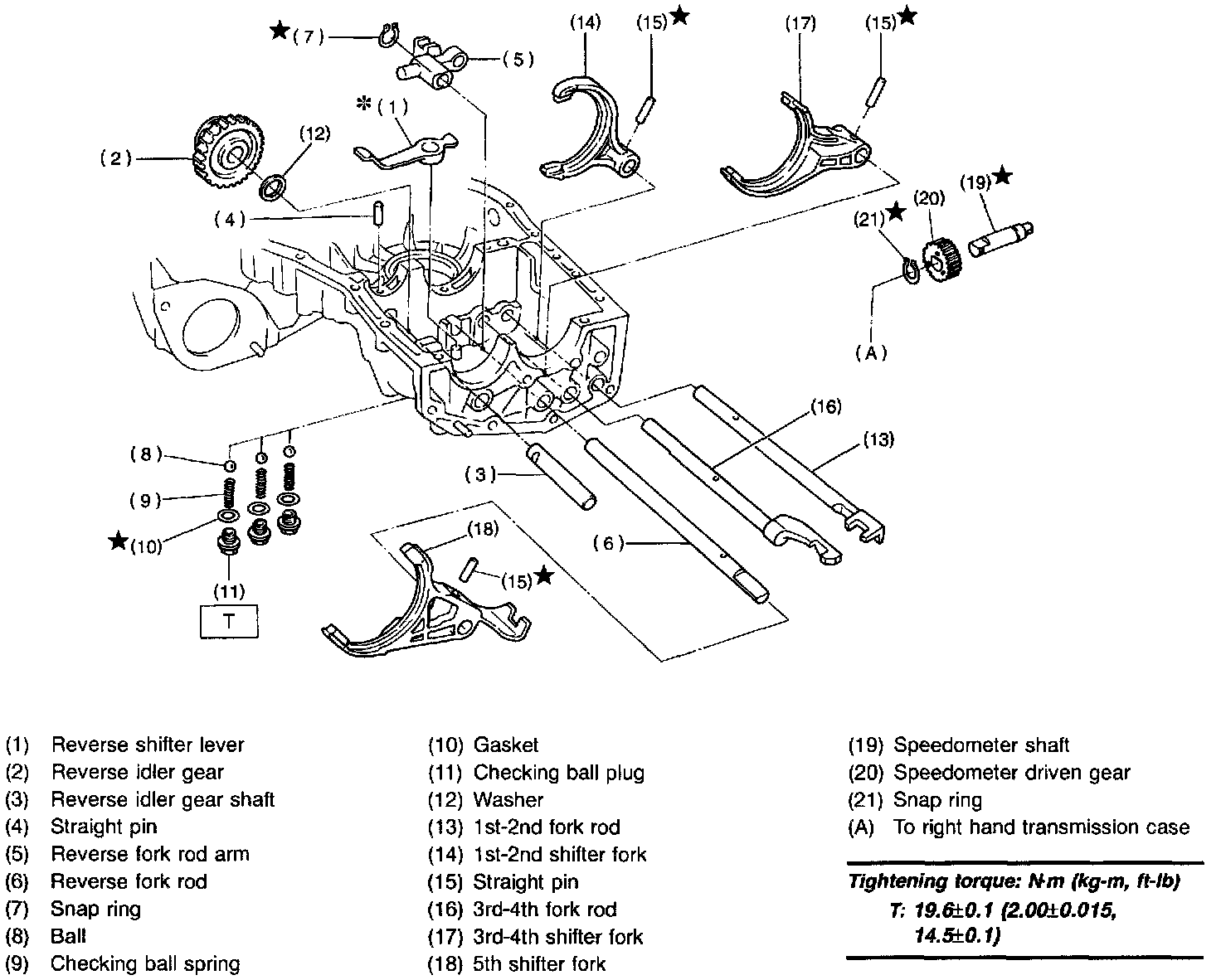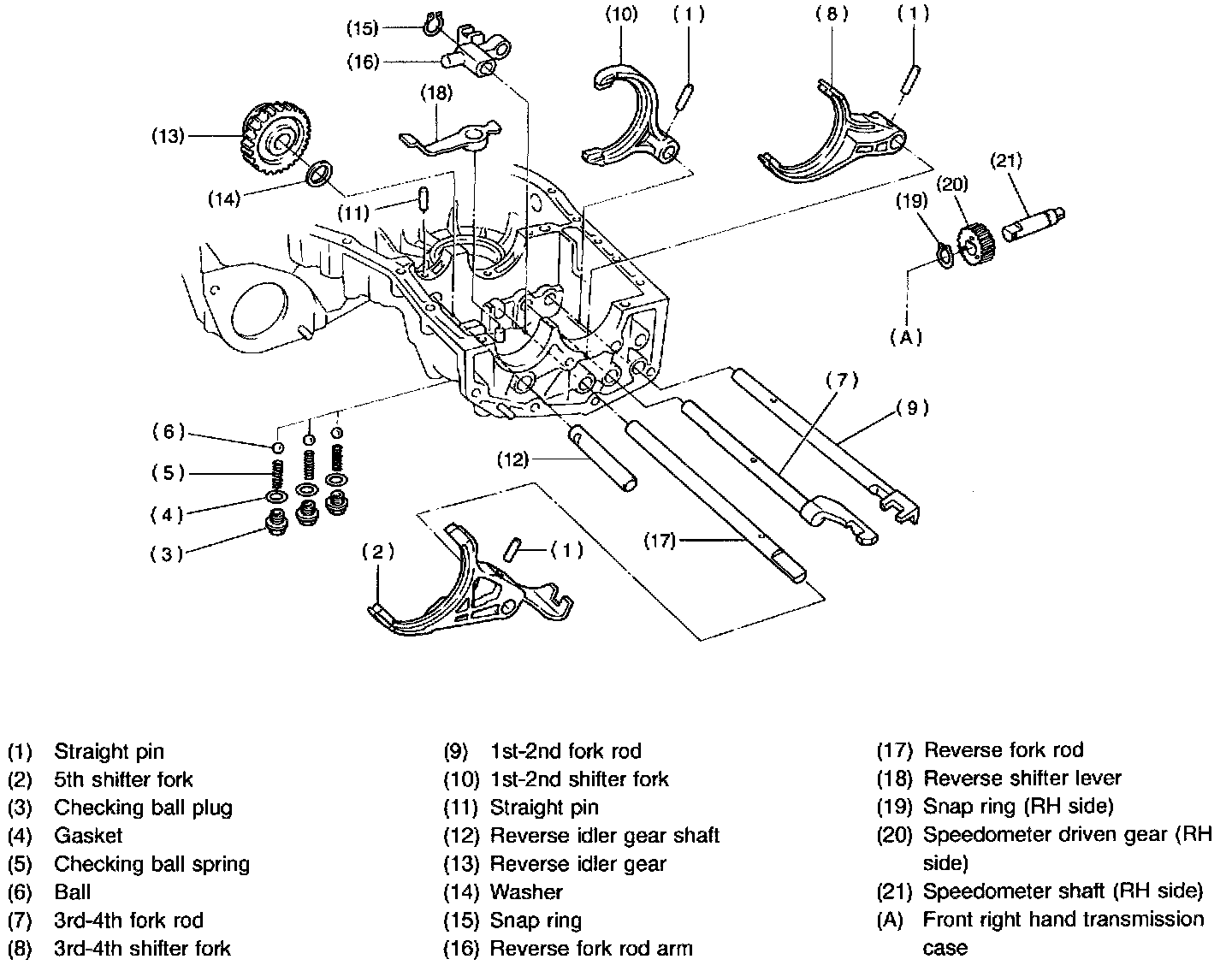 6. Remove outer snap ring, and pull out reverse shifter rod arm from reverse fork rod. Then take out ball, spring and interlock plunger from rod. And then remove rod.