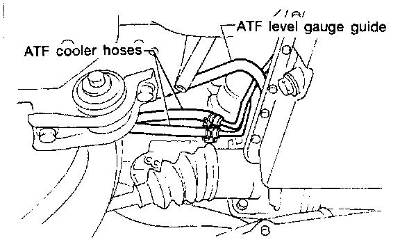 15) Install ATF level gauge guide, and ATF cooler hoses onto pipe. (AT vehicles)