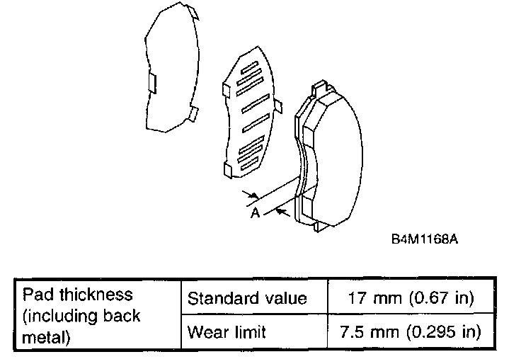 - A wear indicator is provided on the inner disc brake pad. If the pad wears down to such an extent that the end of the wear indicator contacts the disc rotor, a squeaking sound is produced as the wheel rotates. If this sound is heard, replace the pad.