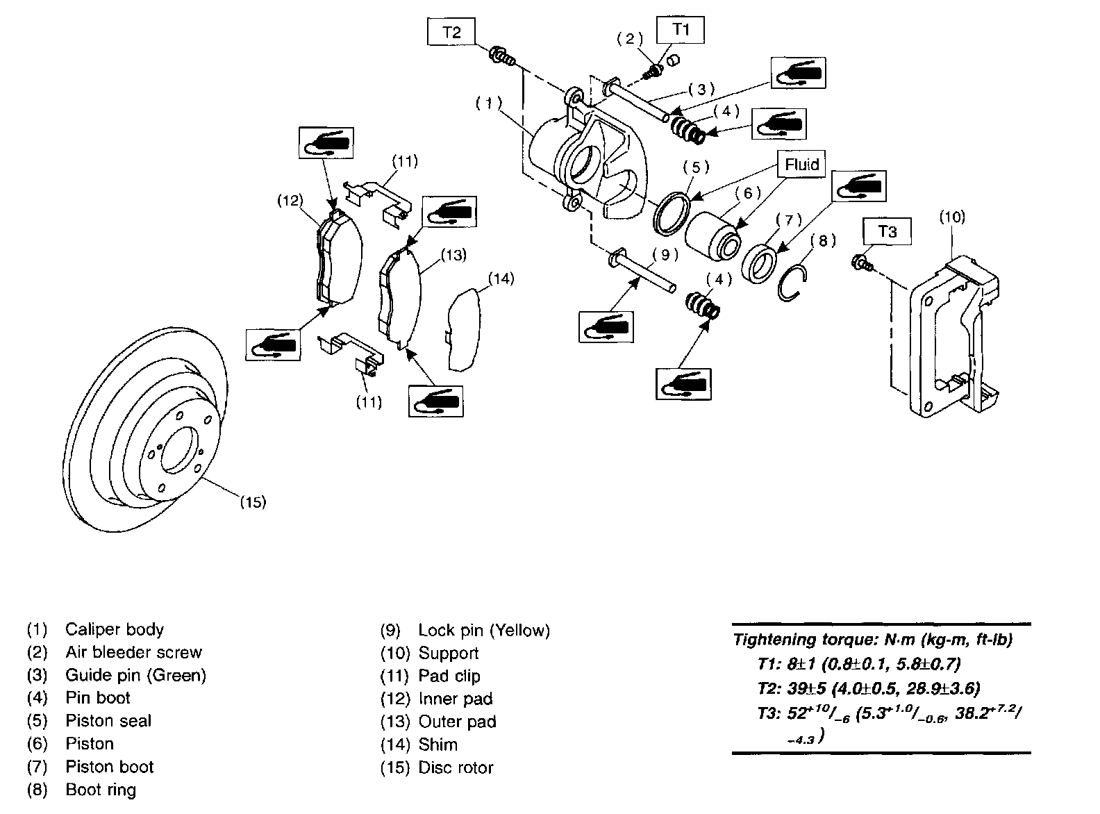- A wear indicator is provided on the inner disc brake pad. If the pad wears down to such an extent that the end of the wear indicator contacts the disc rotor, a squeaking sound is produced as the wheel rotates. If this sound is heard, replace the pad. e Replace pads if there is oil or grease on them.
