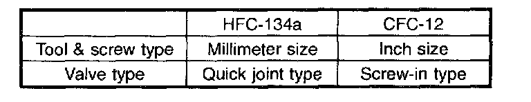 CAUTION: When working on vehicles with the HFC-134a system, only use HFC-134a specified tools and parts. Do not mix with CFC-12 tools and parts. If HFC-134a and CFC-12 refrigerant or compressor oil is mixed, poor lubrication will result and the compressor itself may be destroyed. In order to help prevent mixing HFC-134a and CFC-12 parts and liquid, the tool and screw type and the type of service valves used are different. The gas leak detectors for the HFC-134a and CFC-12 systems must also not be interchanged.