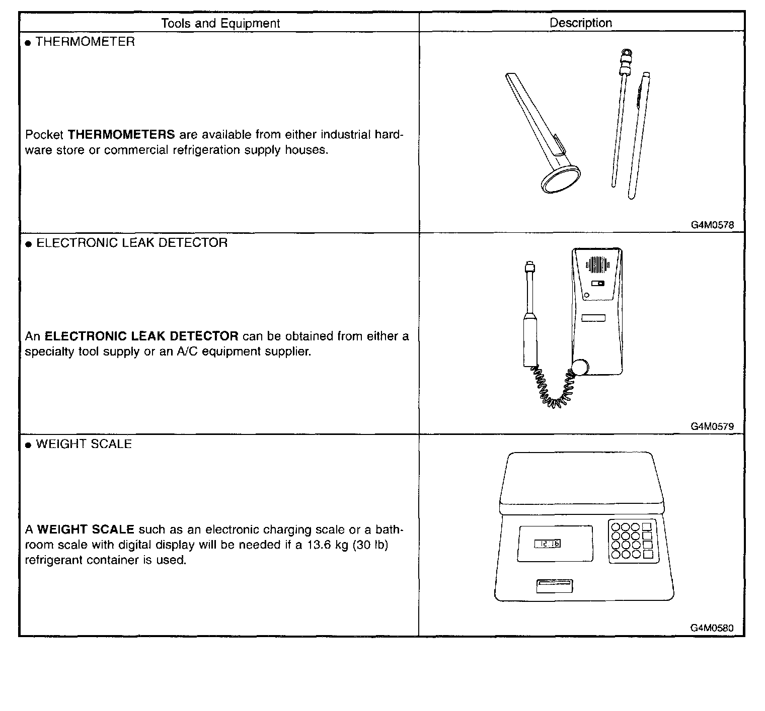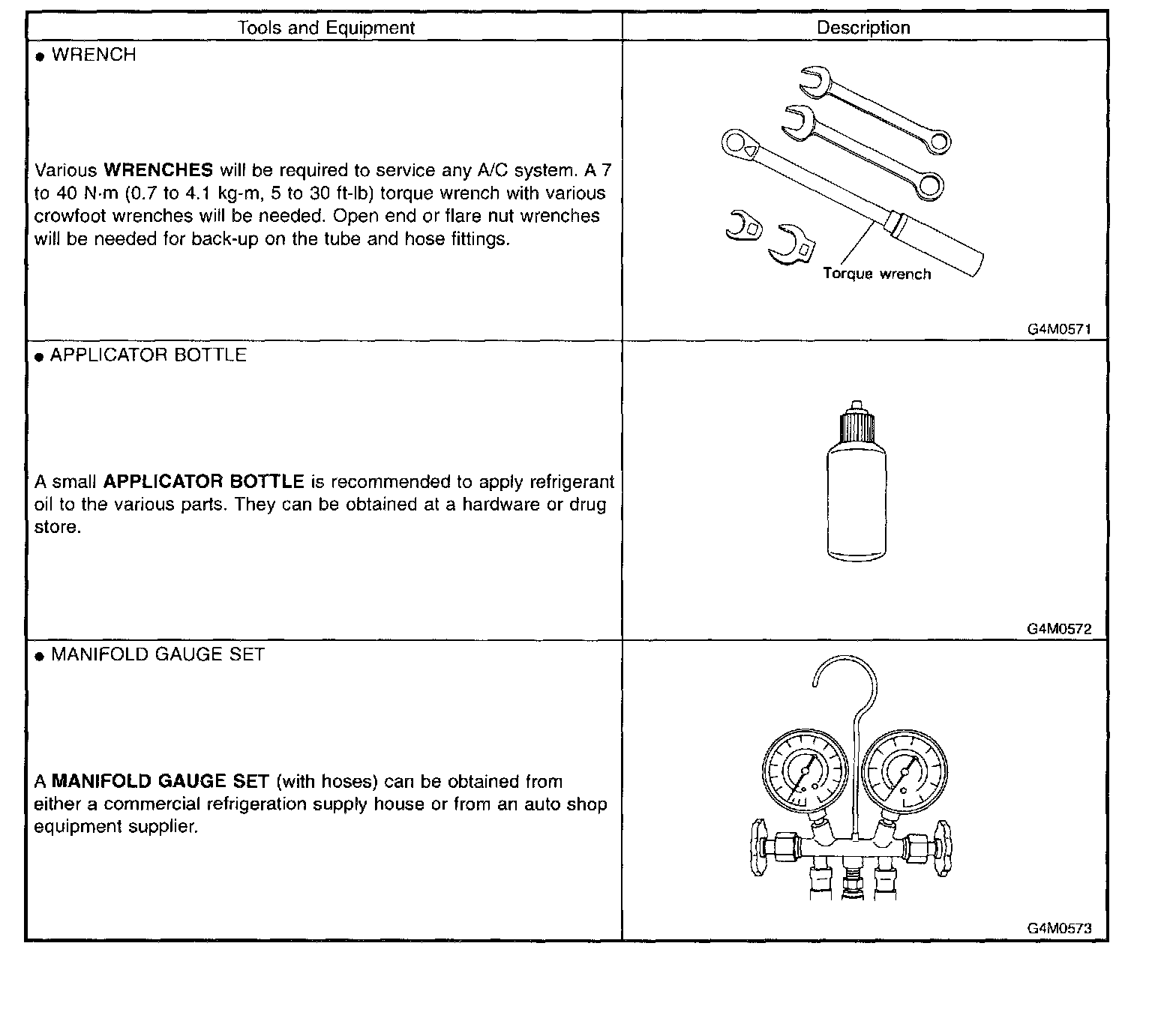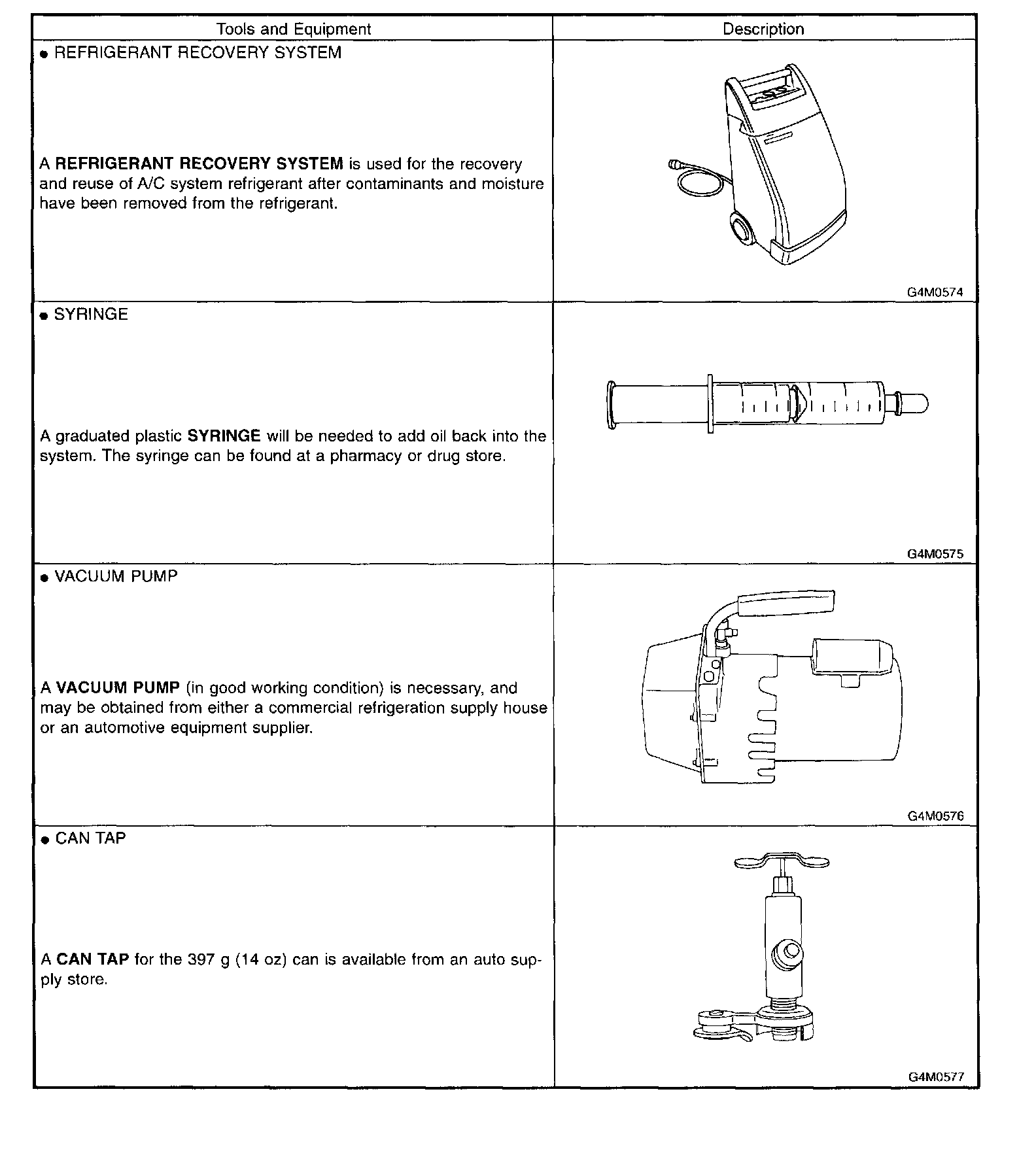 The following section provides information about the tools and equipment that will be necessary to properly service the A/C system.