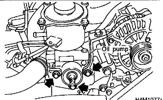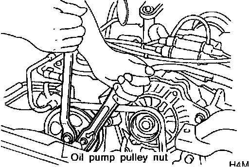 4. Loosen oil pump pulley nut, then remove bolts which secure alternator.
