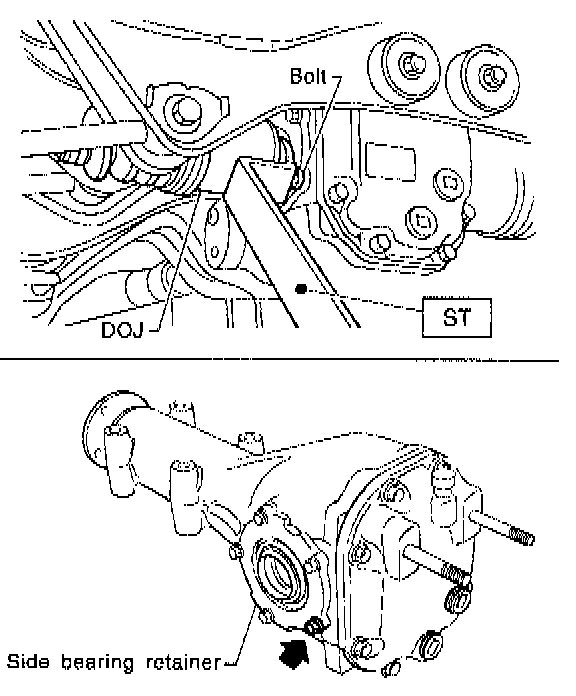 CAUTION: When removing the DOJ from the rear differential, fit ST to the bolt as shown in figure so as not to damage the side bearing retainer.