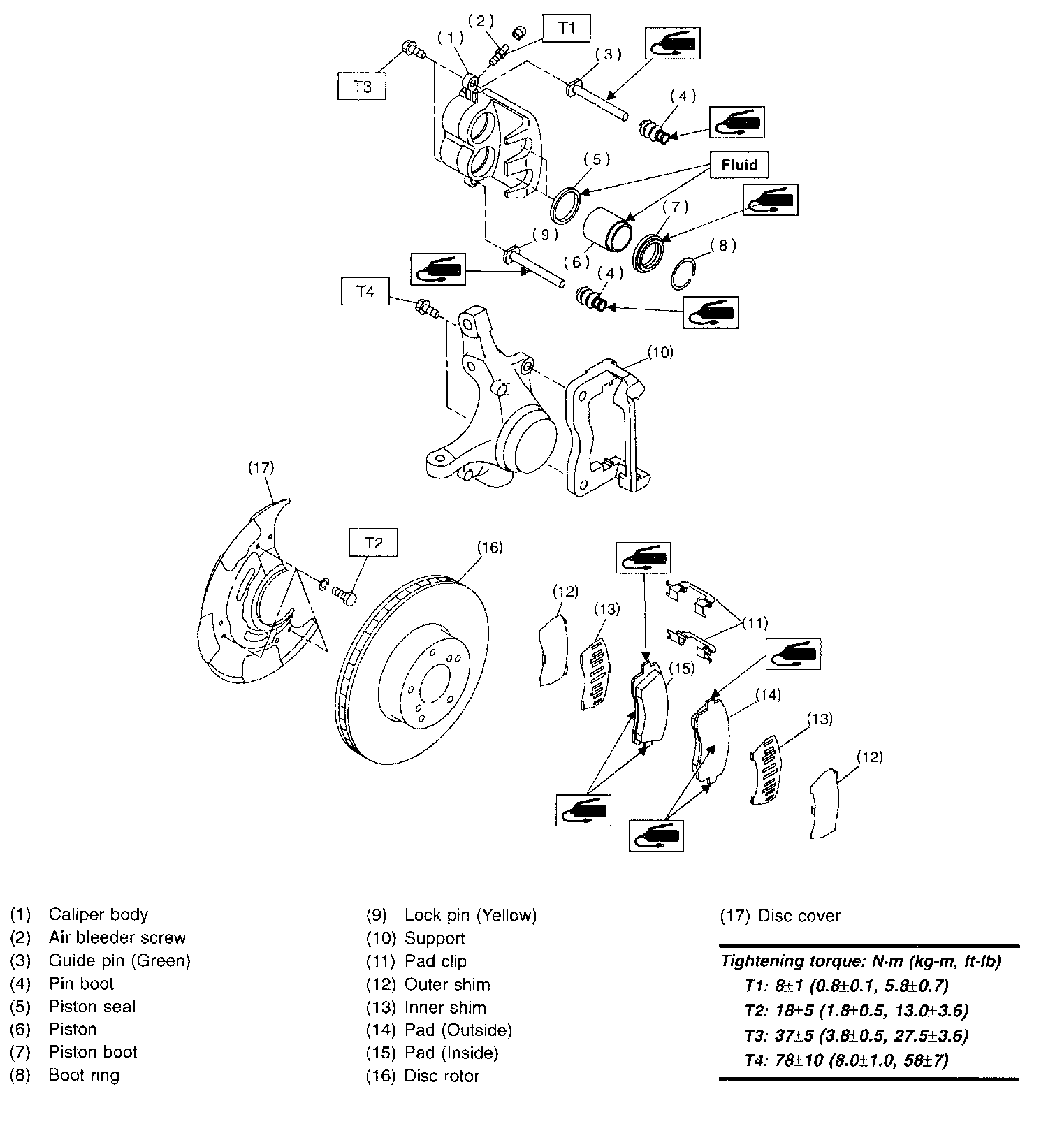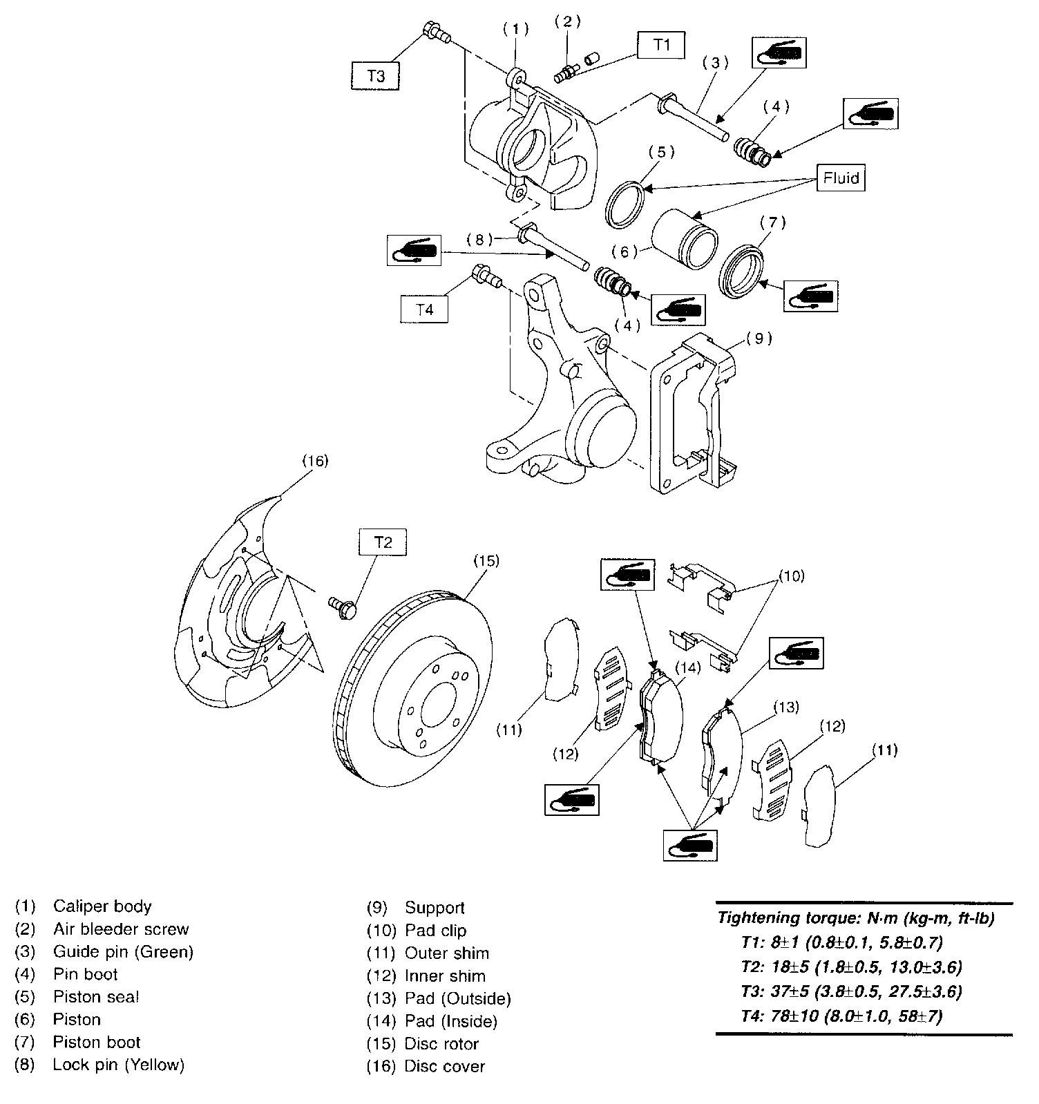 NOTE: If it is difficult to push piston during pad replacement, loosen air bleeder to facilitate work.