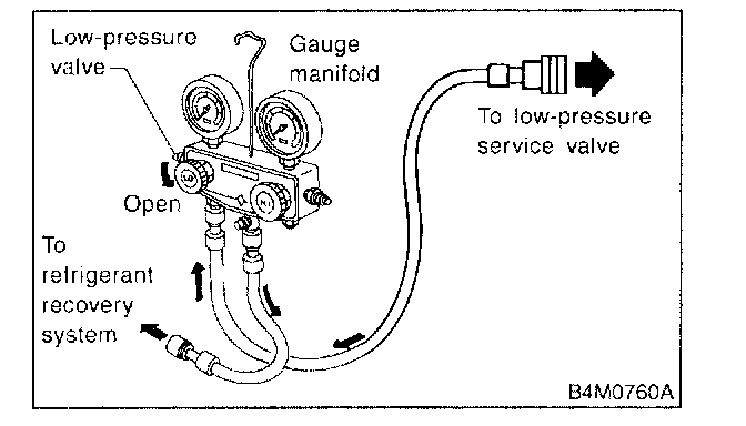 3. Open low-pressure manifold gauge valve slightly, and slowly discharge refrigerant from system.