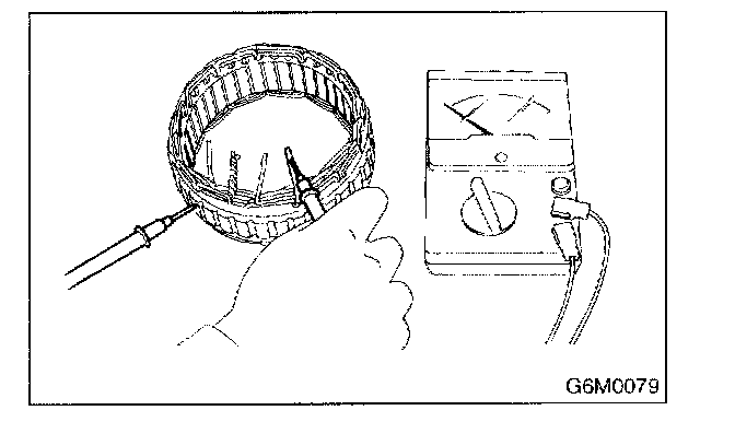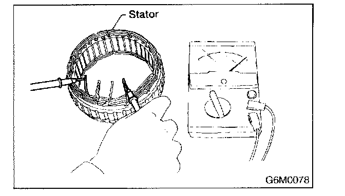 Inspect stator coil for continuity between stator core and each end of the lead wire. If there is continuity, the stator coil is short-circuited, and so replace stator assembly.
