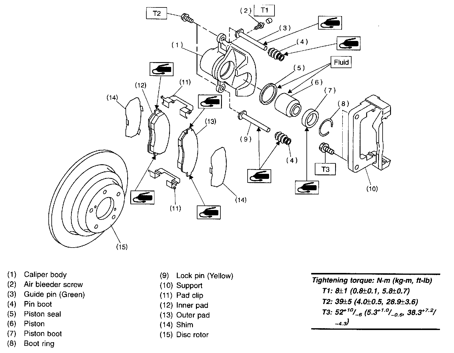 2. Check caliper body and piston for uneven wear, damage or rust.