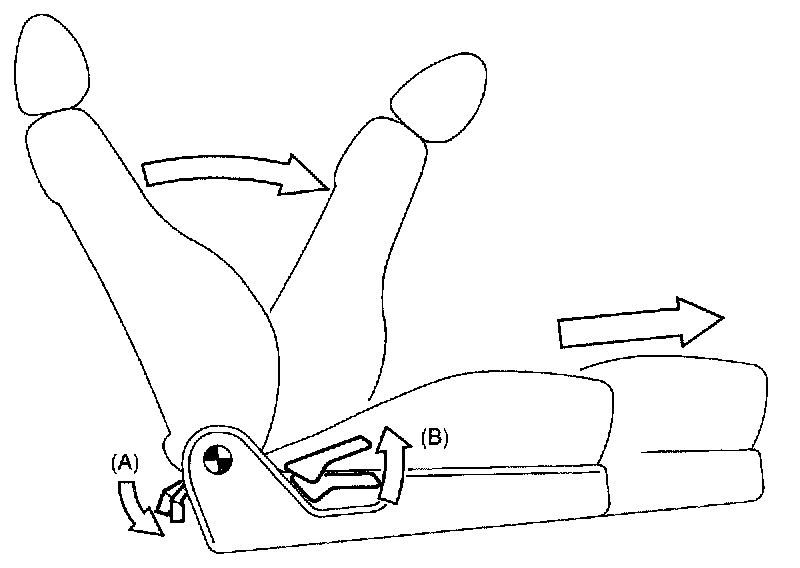 Depress pedal (A) or lift reclining hinge lever (B) to tilt backrest forward. Reclining hinge will then release slide rail lock so that seat moves forward.