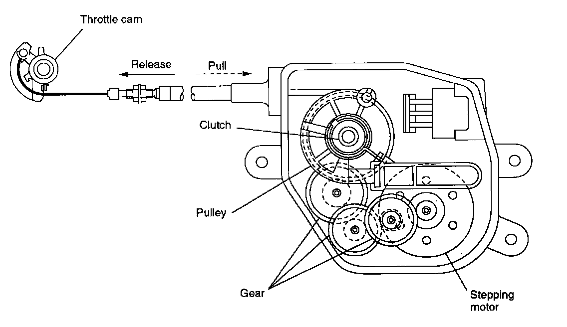 . This causes the stepping motor to operate, pulling the throttle cam for speed control.