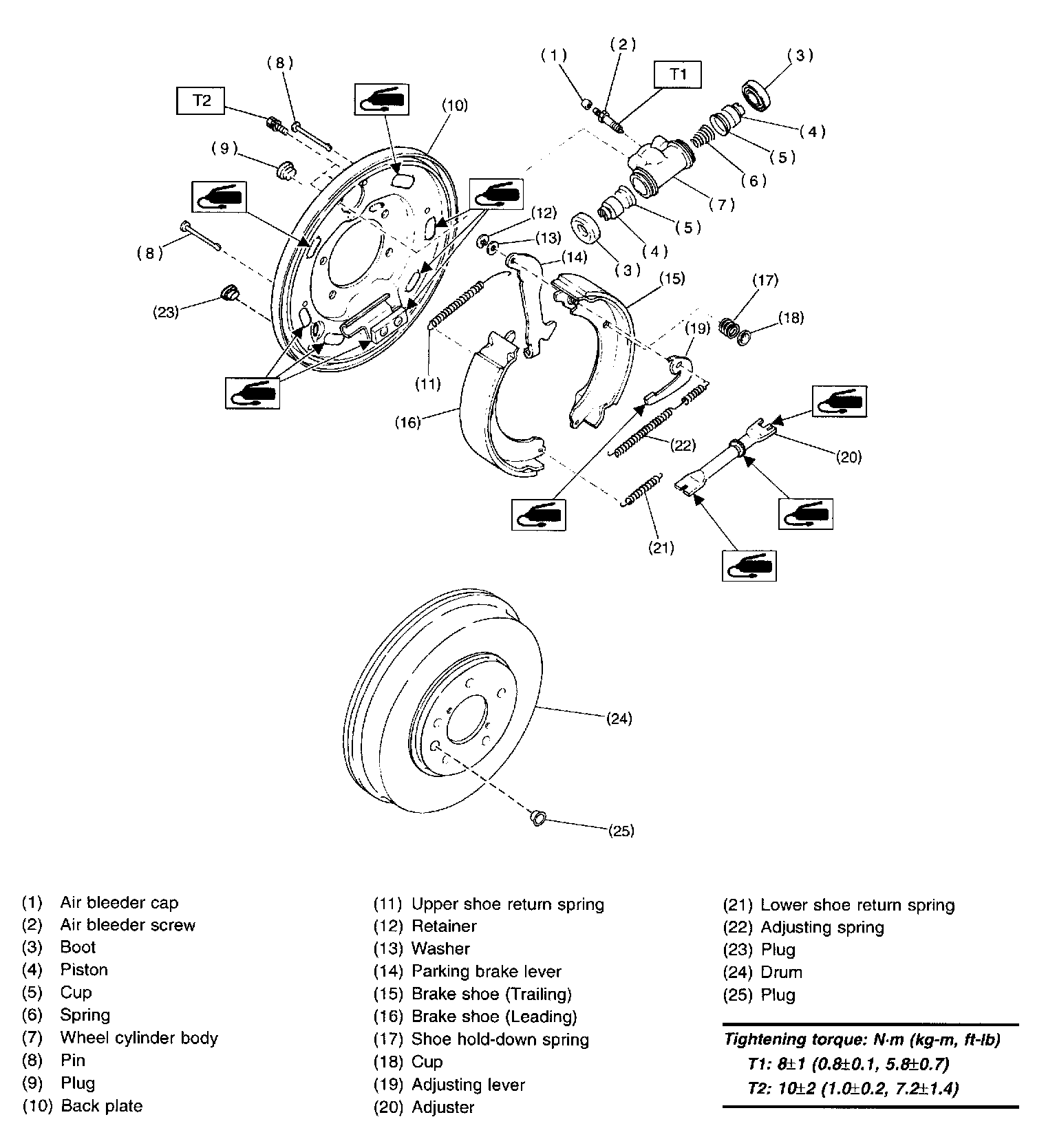 CAUTION: While assembling, be careful to prevent any metal chip, dust or dirt from entering the wheel cylinder.