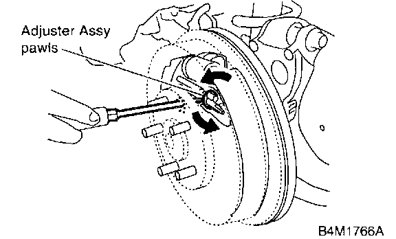 ^ If it is difficult to remove brake drum, remove adjusting hole cover from drum, and then turn adjuster assembly pawls using a slot-type screwdriver until brake shoe separates from the drum.