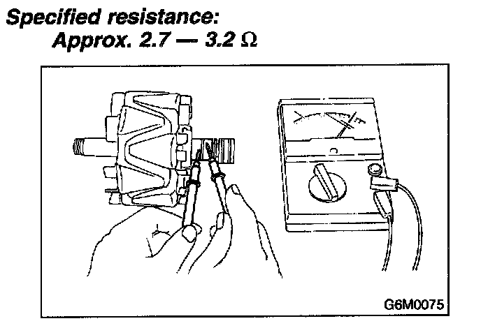 Check resistance between slip rings using circuit tester. If the resistance is not within specification, replace rotor assembly.