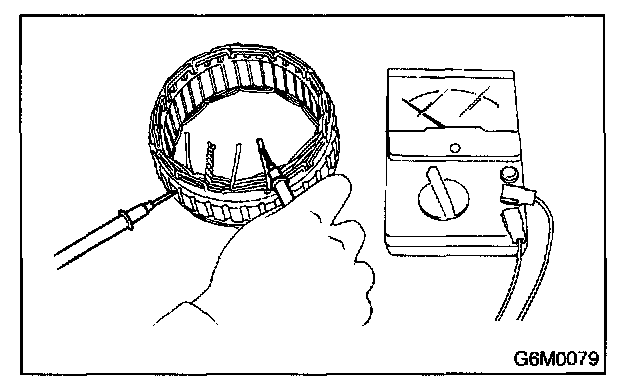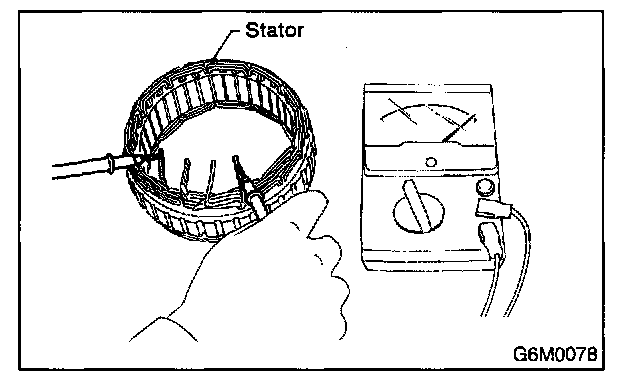 Inspect stator coil for continuity between stator core and each end of the lead wire. If there is continuity, the stator coil is short-circuited, and so replace stator assembly.