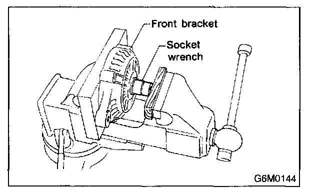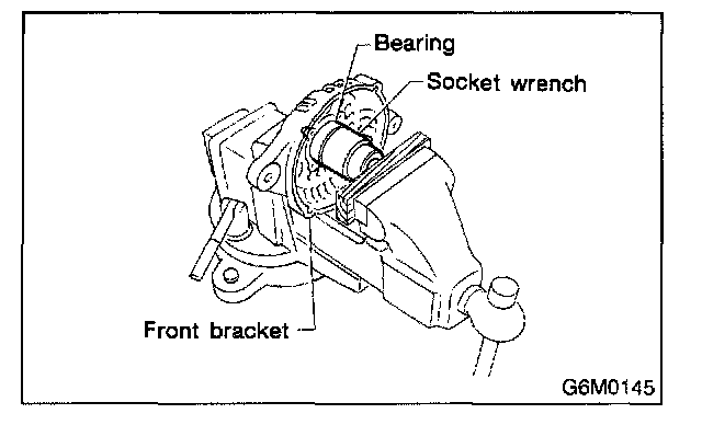 2. Closely install a fit tool on the bearing inner race. Press the bearing down out of front bracket with a hand press or vise. A socket wrench can serve as the tool.