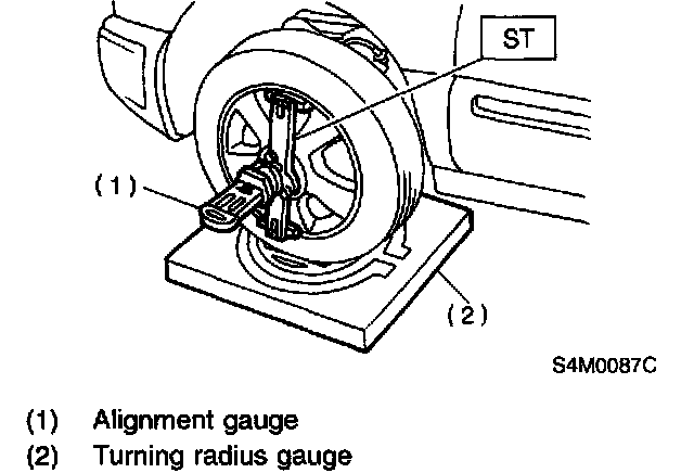 1) Place front wheel on turning radius gauge. Make sure ground contacting surfaces of front and rear wheels are set at the same height.