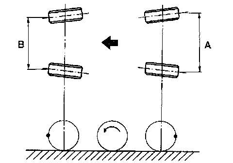 4) Measure distance "B" between left and right marks. Toe-in can then be obtained by the following equation: