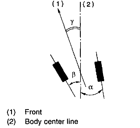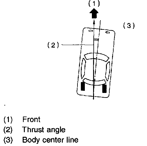 NOTE: Thrust angle refers to a mean value of left and right rear wheel toe angles in relation to vehicle body center line. Vehicle is driven straight in the thrust angle direction while swinging in the oblique direction depending on the degree of the mean thrust angle.