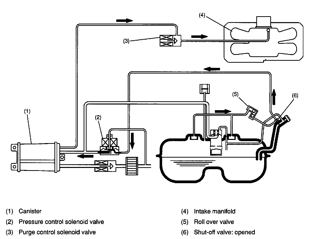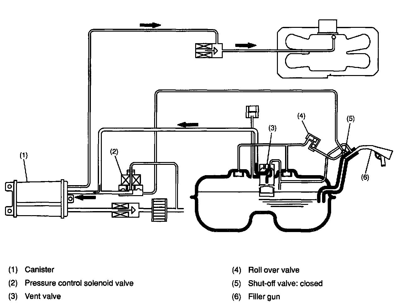 As the fuel enters the fuel tank, the tank inside pressure increases. When the inside pressure becomes higher than the atmospheric pressure, the port of the vent valve opens, allowing the fuel vapors to be introduced into the canister through the vent line. The fuel vapors are absorbed by charcoal in the canister, so the air discharged from the drain valve contains no fuel. When a filler gun is inserted, the shut-off valve closes the evaporation line.