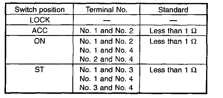4. Turn the ignition key plate to each position and measure the ignition switch resistance.