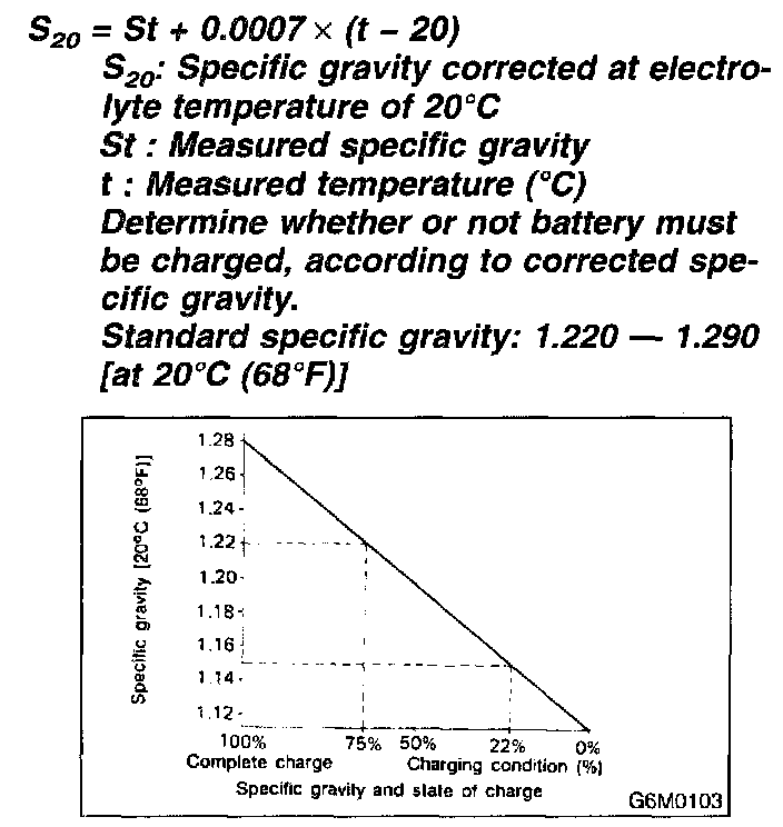 Specific gravity varies with temperature of electrolyte so that it must be corrected at 20 °C (68 °F) using the following equation: