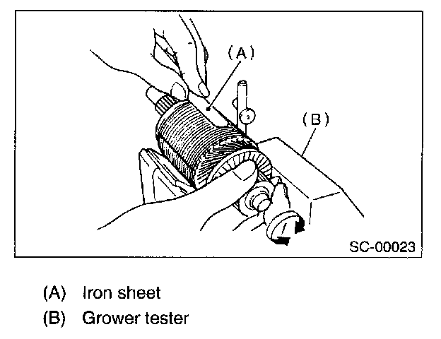 4. Armature short-circuit test Check the armature for short-circuit by placing it on growler tester. Hold a iron sheet against the armature core while slowly rotating armature. A short-circuited armature will cause the iron sheet to vibrate and to be attracted to core. If the iron sheet is attracted or vibrates, the armature, which is short-circuited, must be replaced or repaired.