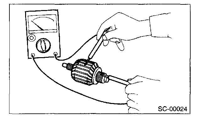 Using a circuit tester, touch one probe to the commutator segment and the other to shaft. There should be no continuity. If there is continuity, the armature is grounded. Replace the armature if it is grounded.
