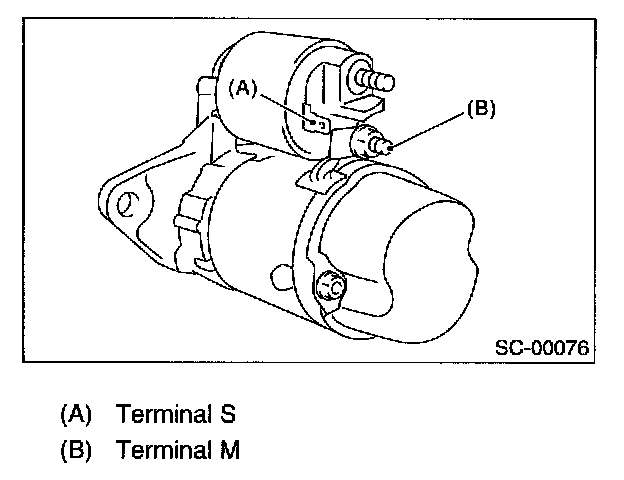 2. Disconnect the connector from terminal M, and then connect the positive terminal of battery and terminal M using a lead wire and ground terminal to starter body.