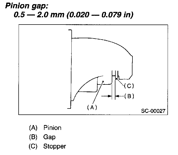 2. If the pinion gap is outside specified range, remove or add number of adjustment washers used on the mounting surface of switch assembly until correct pinion gap is obtained.