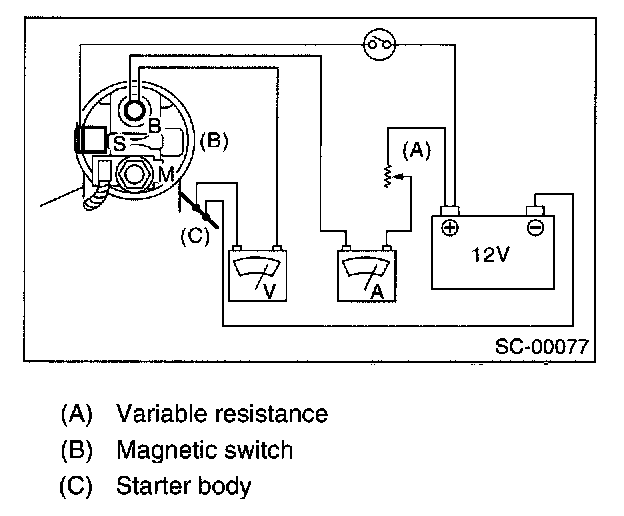 With switch on, adjust the variable resistance to obtain 11 V, take the ammeter reading, and then measure the starter speed. Compare these values with the specifications.
