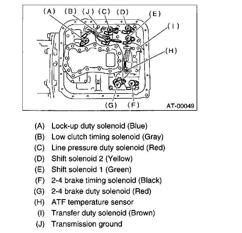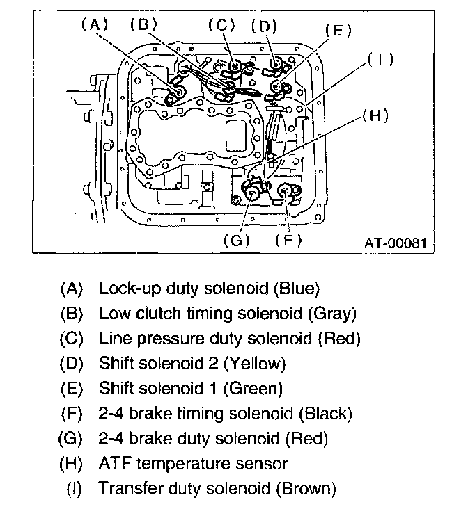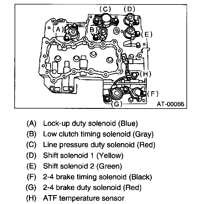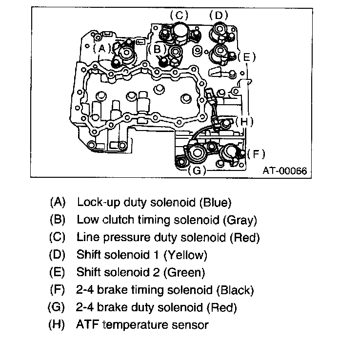 11. Install the sensor, solenoids and duty solenoids to specified positions.