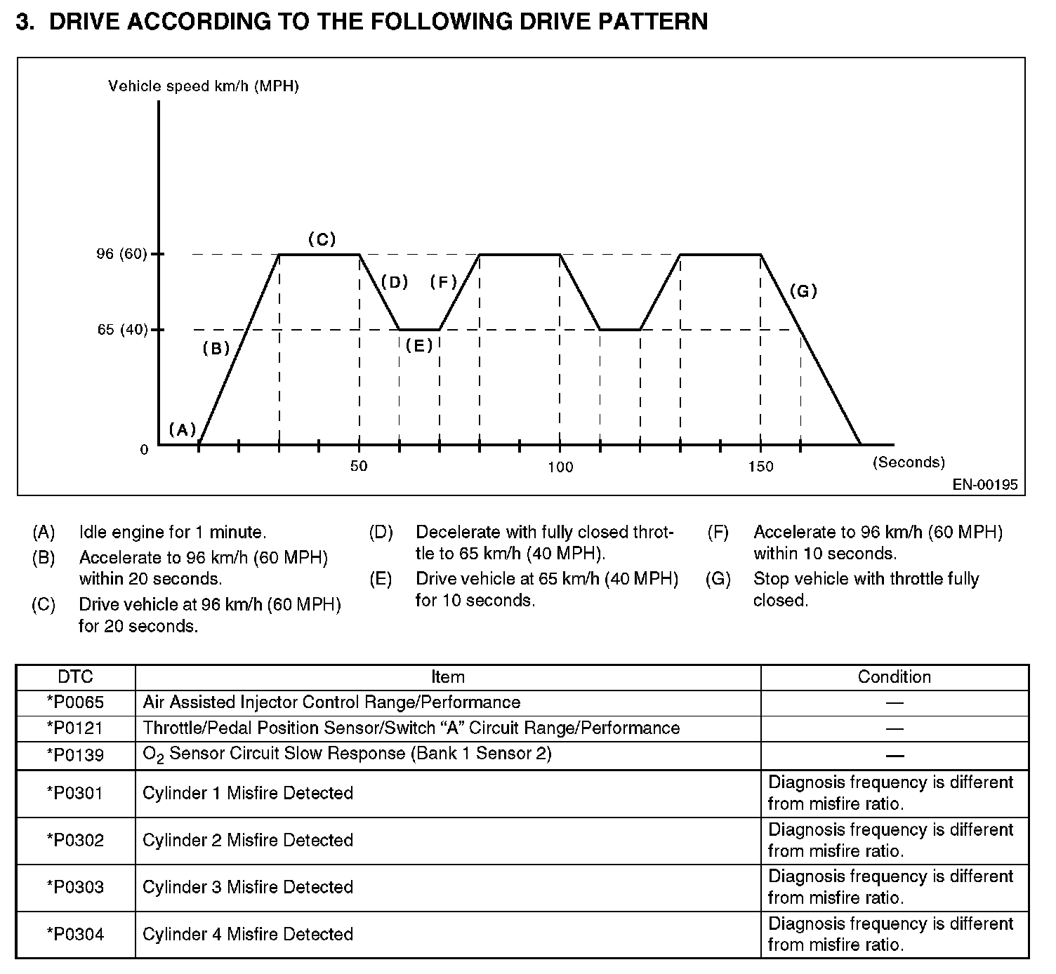 There are three drive patterns for the trouble diagnosis. Driving in the specified pattern allows to diagnose malfunctioning items listed. After the malfunctioning items listed below are repaired, always check whether they correctly resume their functions by driving in the required drive pattern.