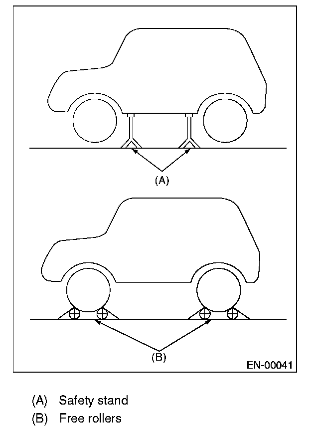 - In order to prevent the vehicle from slipping due to vibration, do not place any wooden blocks or similar items between the safety stands and the vehicle.