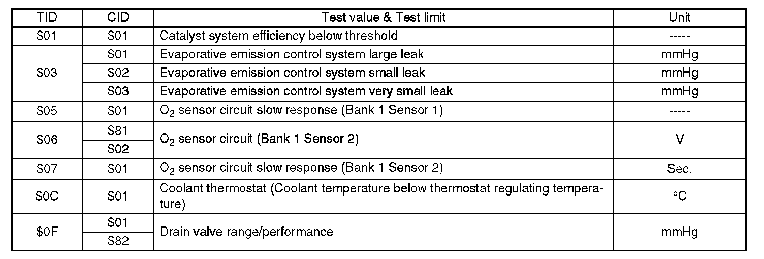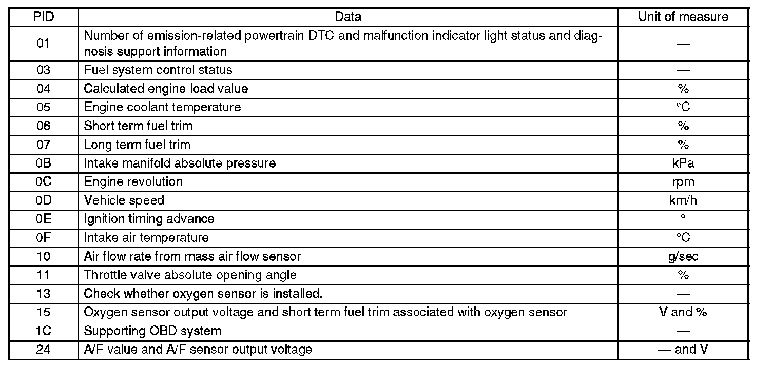 Refers to data denoting the operating condition when trouble is sensed by the on-board diagnosis system. A list of the support data and PID (Parameter Identification) codes are shown in the table.