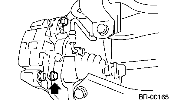 ^ A wear indicator is provided on the inner disc brake pad. If the pad wears down to such an extent that the end of the wear indicator contacts the disc rotor, a squeaking sound is produced as the wheel rotates. If this sound is heard, replace the pad.