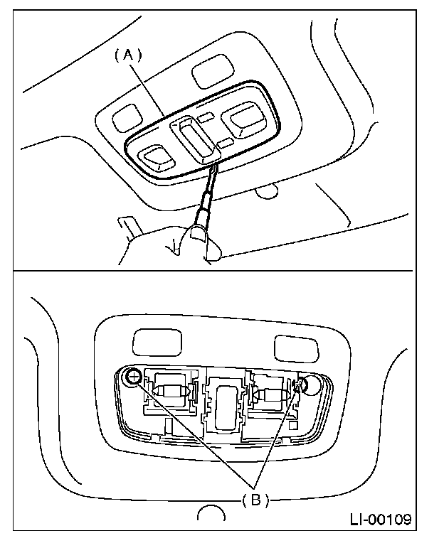2. Remove lens (A) and spot light mounting screw (B).