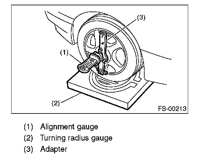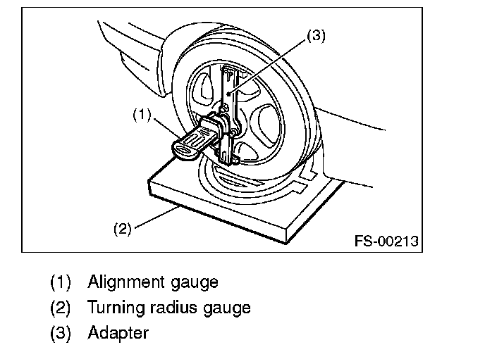 1. Place the front wheel on the turning radius gauge. Make sure the ground contact surfaces of front and rear wheels are at the same height.