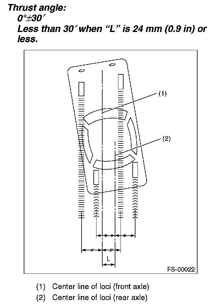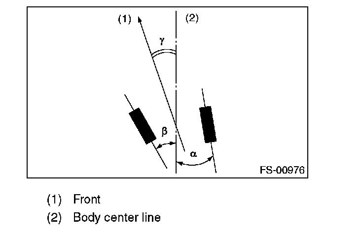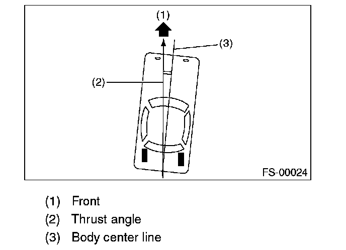 NOTE: Thrust angle is a mean value of left and right wheel toe angles in relation to the vehicle body center line. Vehicle is driven straight in the thrust angle direction while slanting in the oblique direction depending on the degree of the mean thrust angle.