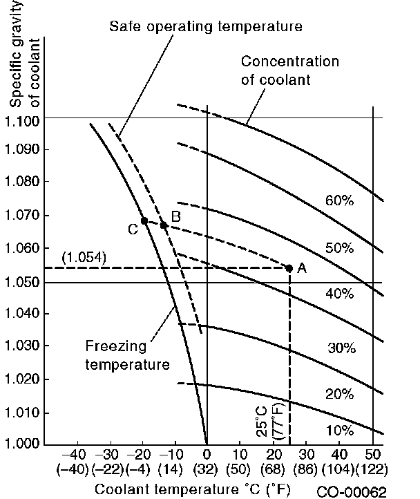 If the coolant temperature is 25°C (77°F) and its specific gravity is 1.054, the concentration is 45% (point A), the safe operating temperature is -14°C (7°F) (point B), and the freezing temperature is 20°C (-4°F) (point C).