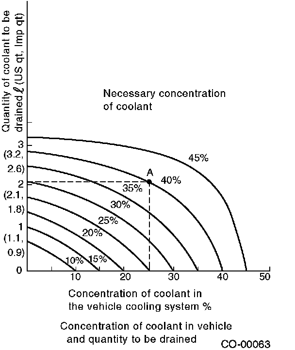 Assume that the coolant concentration must be increased from 25% to 40%. Find point A, where the 25% line of coolant concentration intersects with the 40% curve of the necessary coolant concentration, and read the scale on the vertical axis of the graph at height A. The quantity of coolant to be drained is 2.1 Q (2.2 US qt. 1.8 Imp qt.). Drain 2.1 Q (2.2 US qt. 1.8 Imp qt.) of coolant from the cooling system and add 2.1 Q (2.2 US qt. 1.8 Imp qt.) of the undiluted solution of SUBARU coolant.