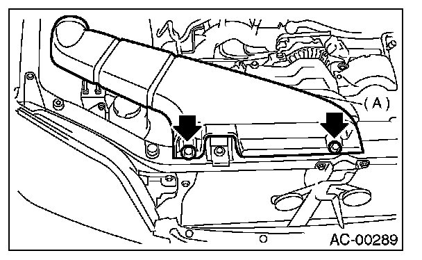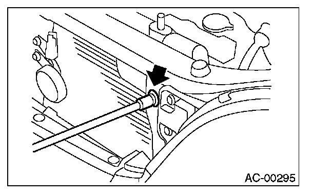 6. Remove 2 bolts. While lifting condenser, pull it out through the space between the radiator and the radiator panel.