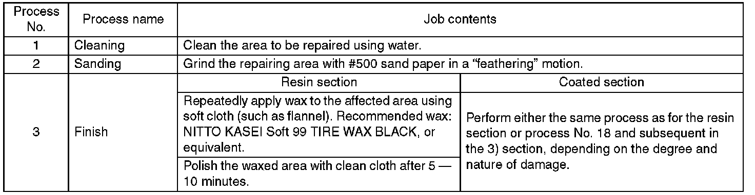 NOTE: All PP bumpers are provided with a grained surface, and if the surface is damaged, it cannot normally be restored to its former condition. Damages limited to the shallow scratches that cause only a change in the luster of the base material or coating, can be almost fully restored. Before repairing a damaged area, explain this point to the customer and obtain an understanding about the matter. Repair methods are outlined below, based on a classification of the extent of damage.