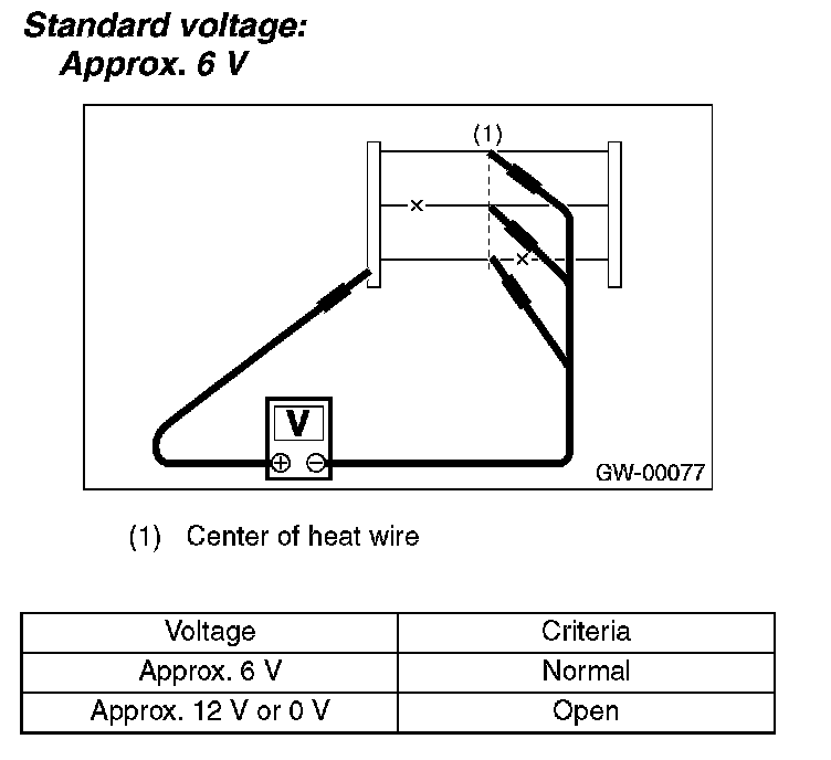 - If the measured value is 12 V, the circuit is open between heat wire center and positive (+) terminal of tester probe.