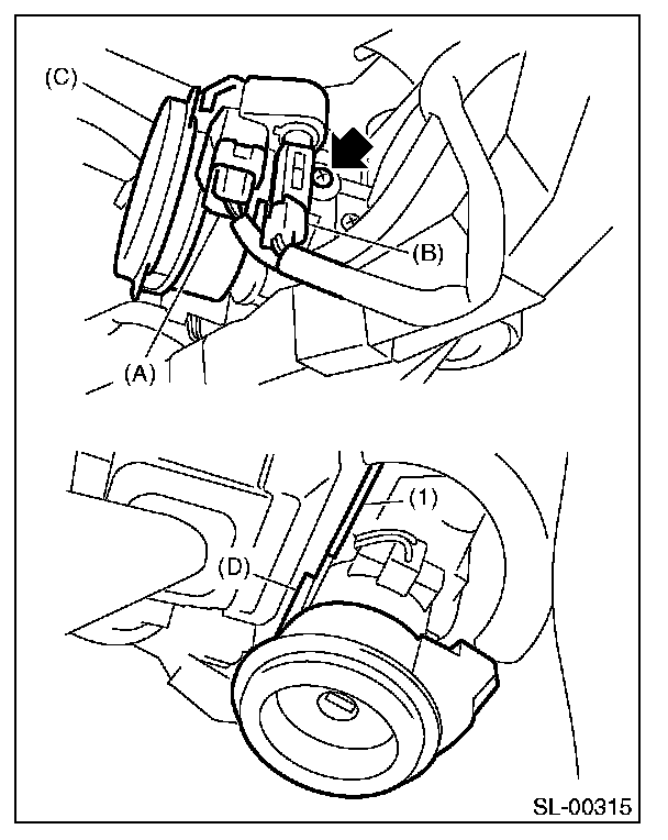 5. Loosen the screw and release the lock (D) at opposite side using flat-tip screwdriver (1), and then detach the immobilizer antenna (C).