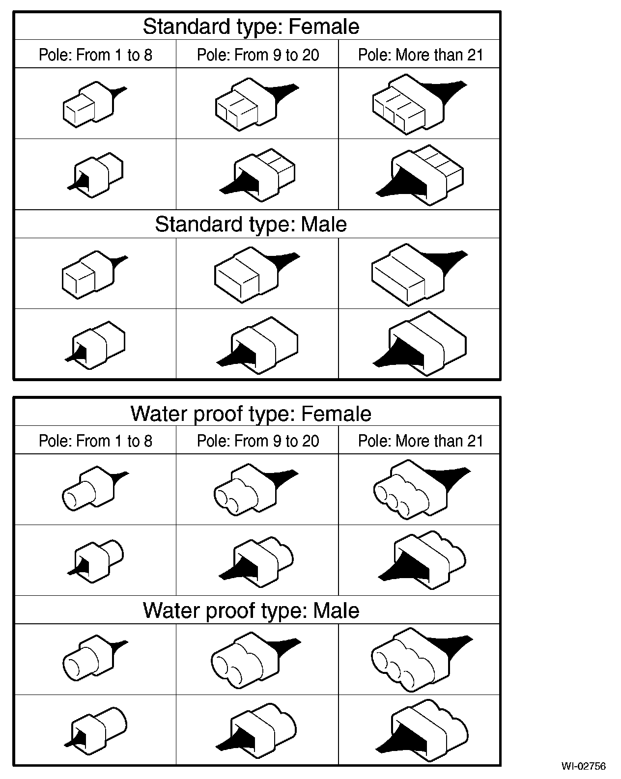 A number of connector symbols are used in each wiring diagram to easily identify the wiring harness connectors.